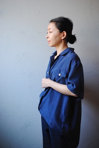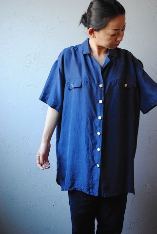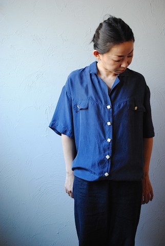 ネイビー半袖シルクシャツは細身のボトムスや短パン、