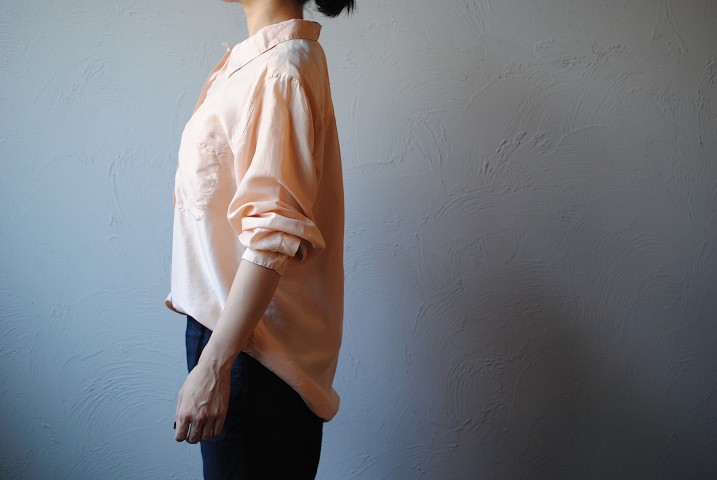 見るからになめらかそうなベビーピンクの長袖シャツ。