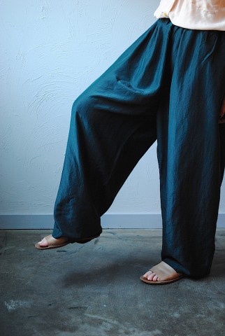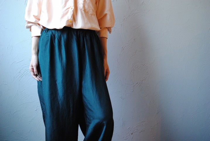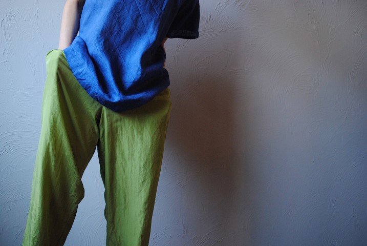 ショッキンググリーンが目を惹くシルクパンツは