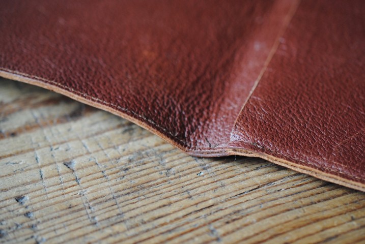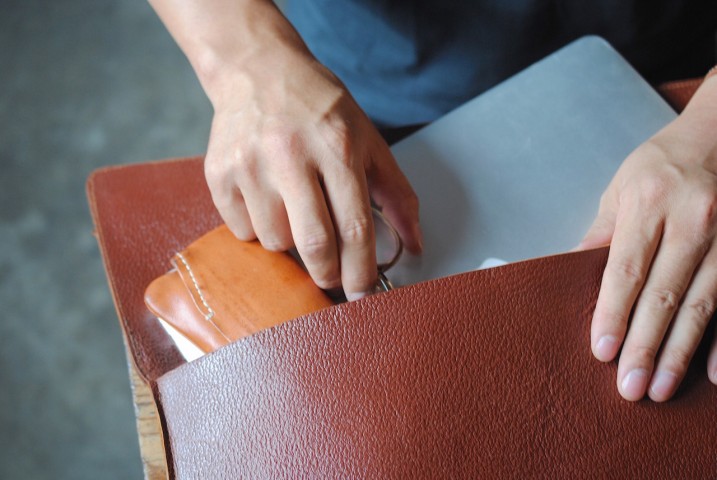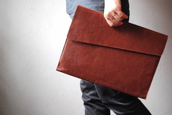 蓋となる返しのカッティングが特徴的なレザーブリーフケース。