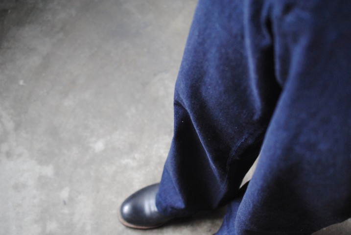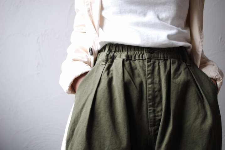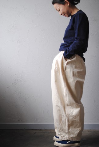 ワークペインターのようなシルエットながら、ワイドトラウザーとも思えます。