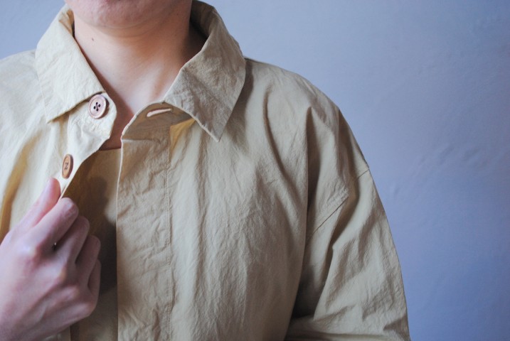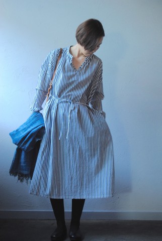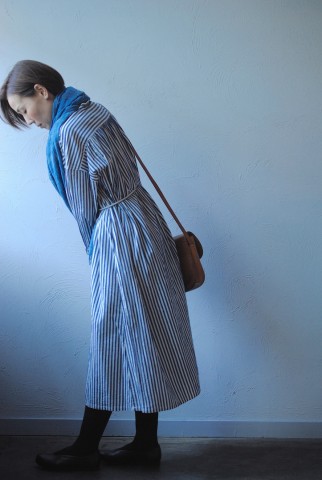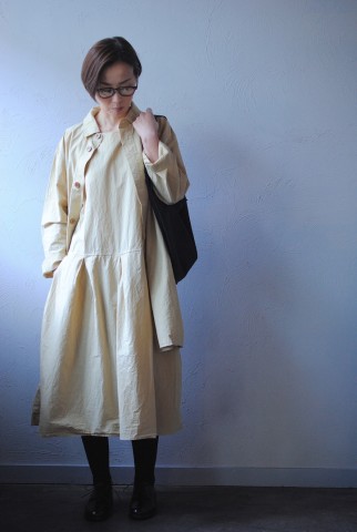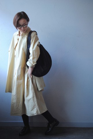 ワンピースとシャツコートを同生地で合わせたカジュアル感。