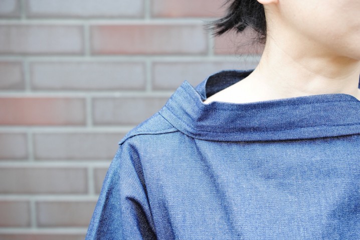 仕事道具を入れるための大きなポケット、衣類をカバーするために着やすく大きく開いたボートネック形の首回り。