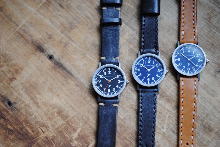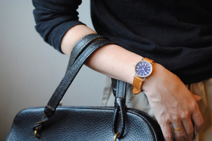 ネイビーの文字盤にキャメルのUKハンドステッチレザーのコンビは