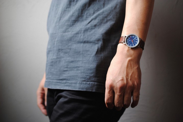 ネイビーの文字盤にブラウンベルト、赤針のカジュアル感