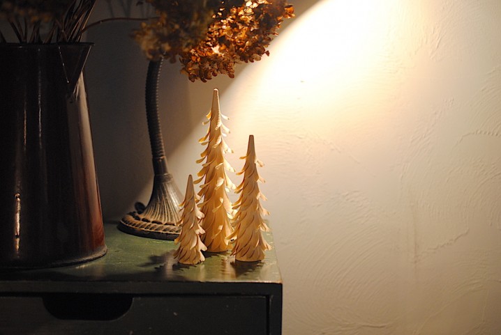 ひとつひとつ手仕事で作られる木のモチーフは陰影も素敵。