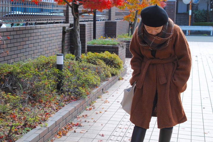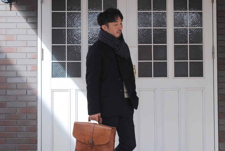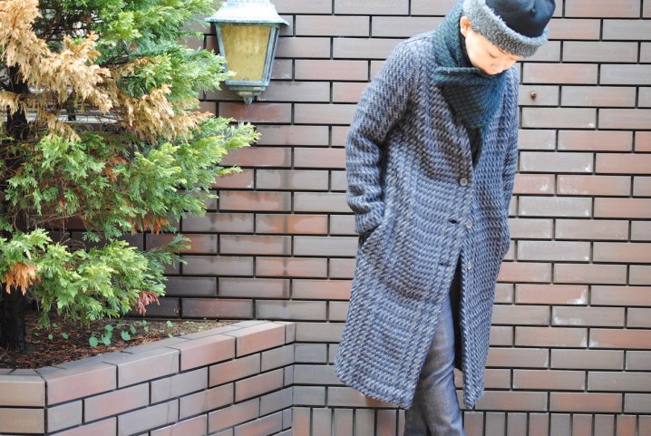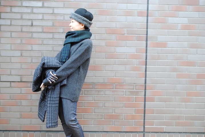 首回りはコートと同柄で編まれたブラニガンのマフラー、