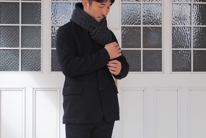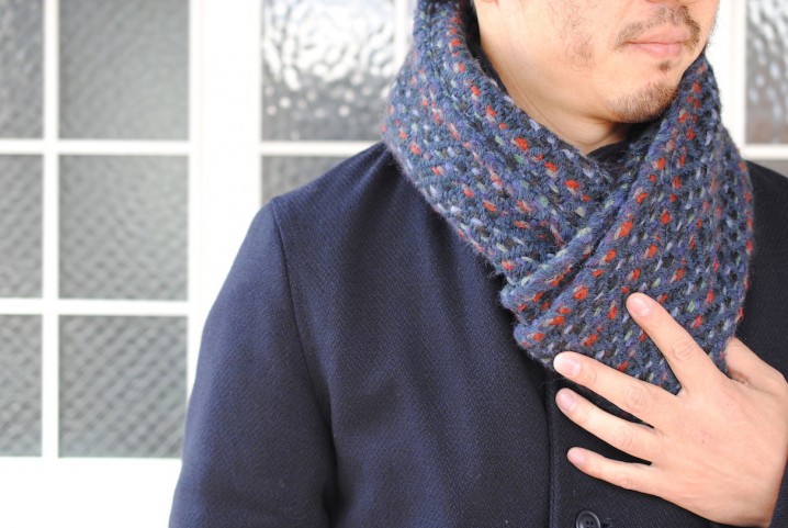 日本の刺し子のような編み方がハンドメイドのような作りのマフラーをアクセントに。