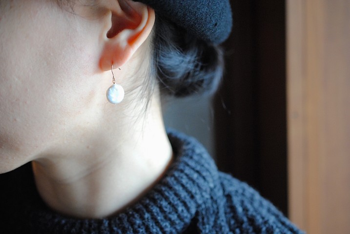 貝殻のように平たいパールピアス、