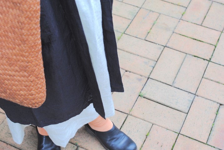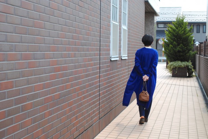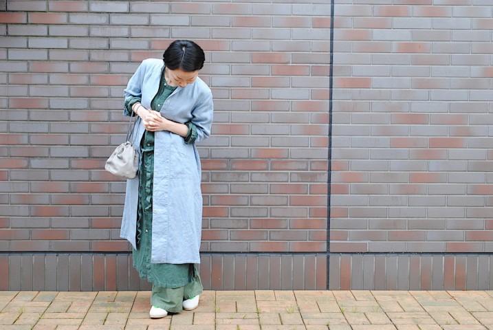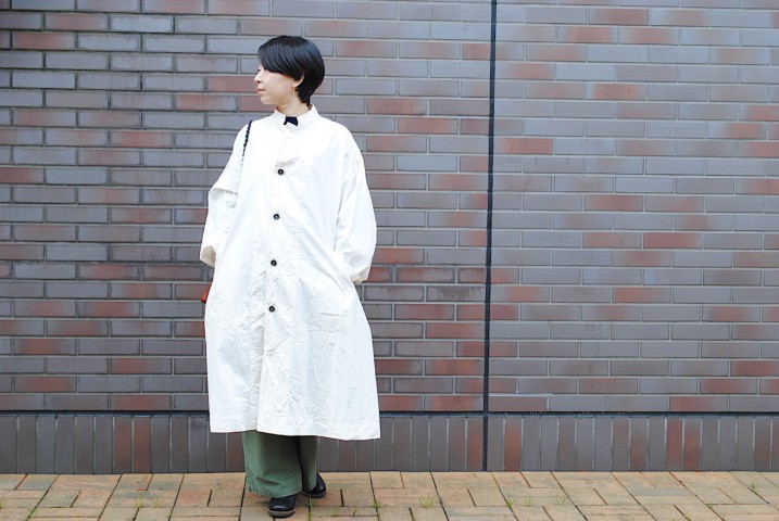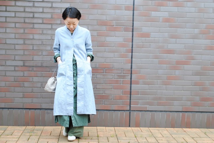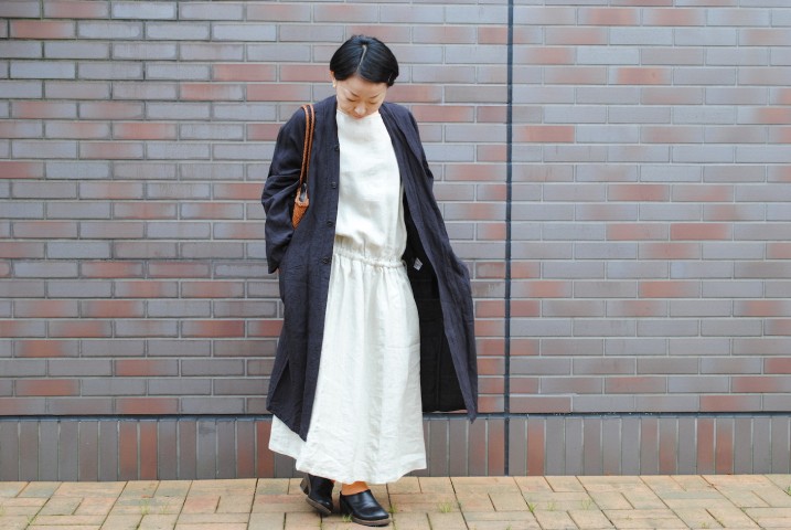 ワークコートのようでワンピース、フロントを開けてコート風に着てみました。