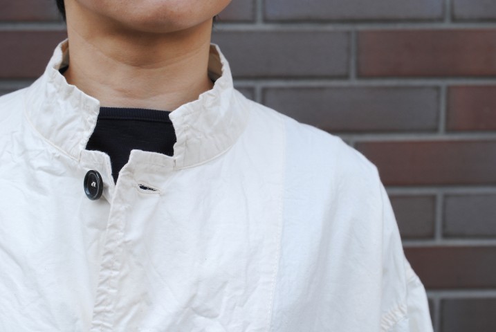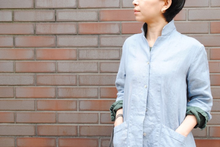 襟元はトップまで留めるとスタンドカラーに