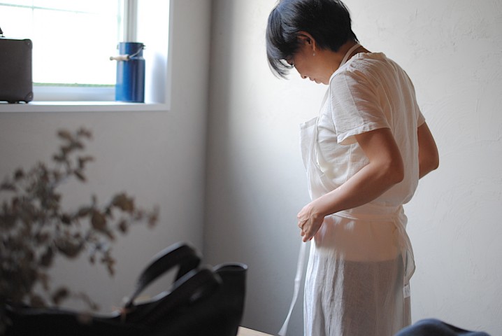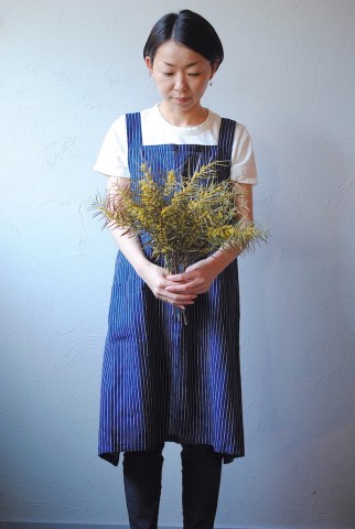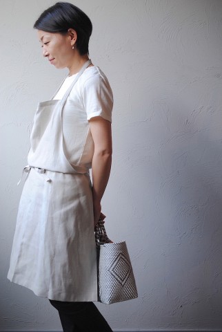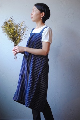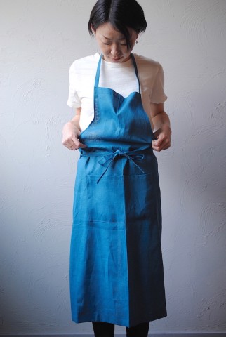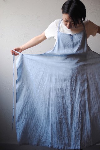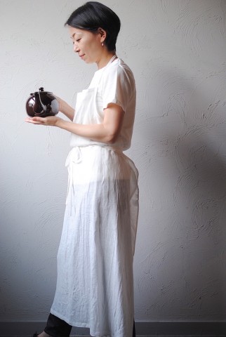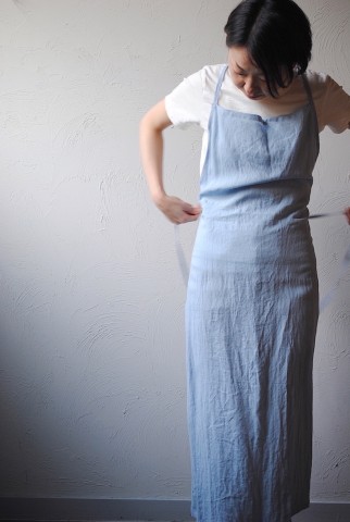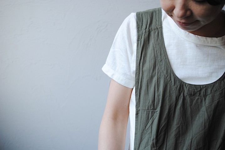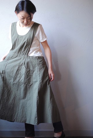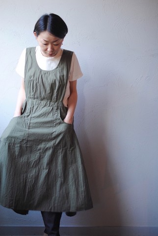 染色してカーキ色をまとった、ワンピースのようなエプロンです。