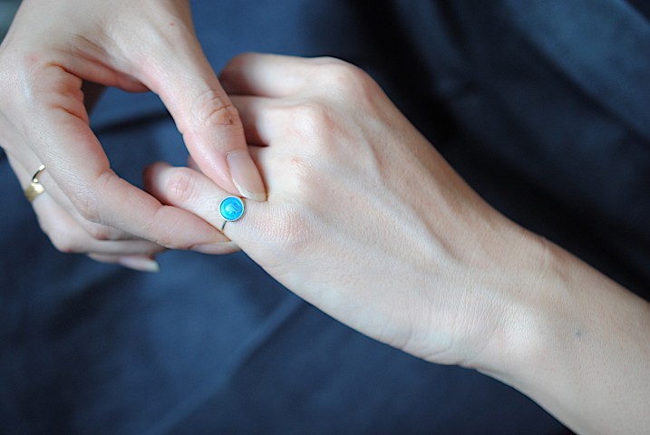 シルバーの細い土台に小指サイズの小ささが華奢で可愛らしいリングです。