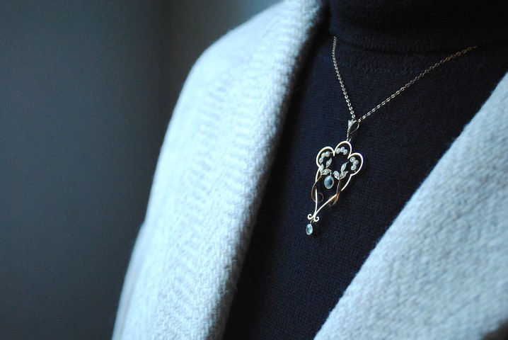 9K Gold Seed Pearl Aquamarine Necklace