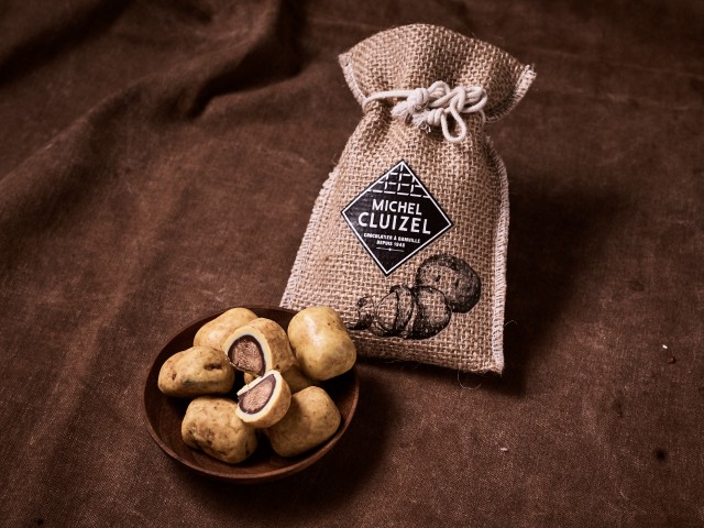 と錯覚が楽しいポムドテールはホワイトチョコレートに包まれたプラリネ。