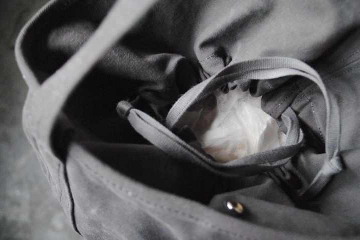 ミリタリー仕様そのままに、きゅっと綿紐でしばれる作り。