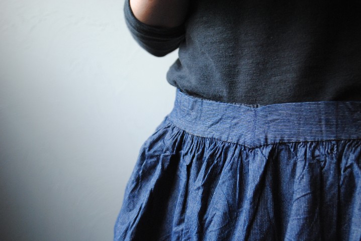 ハリ感の残るしっかりとした生地は極細のインディゴストライプが上品な印象。