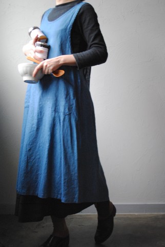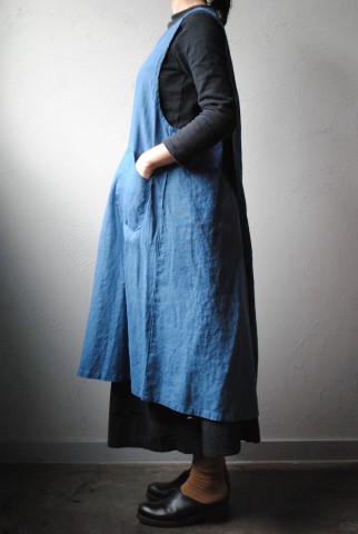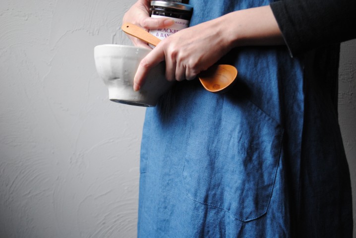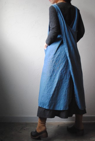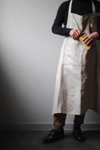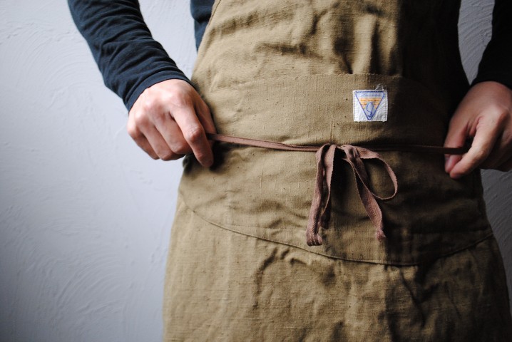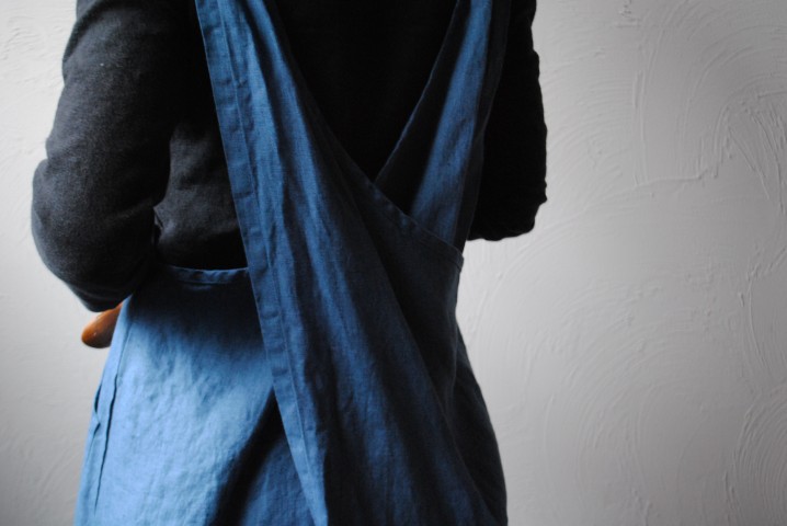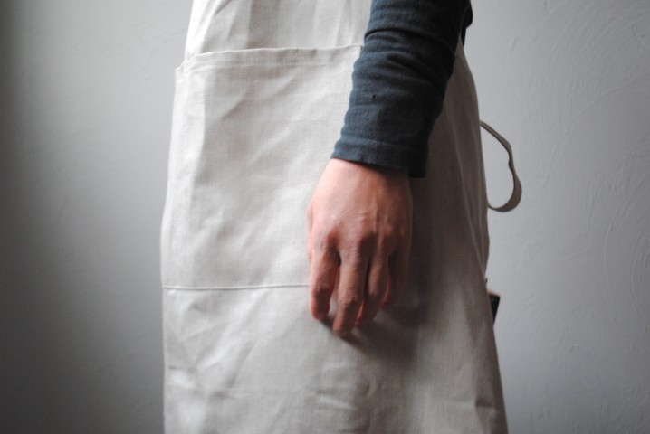 リネン100%の糸で織られたデニム地を使用したエプロン。