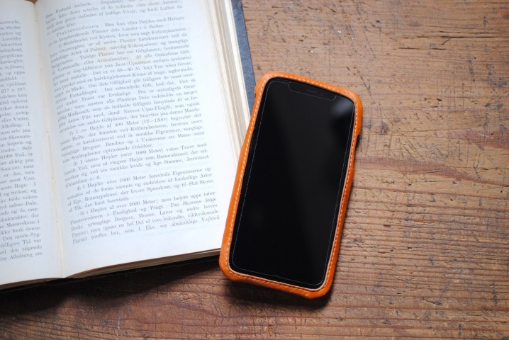 iPhoneの全面四方部分は形状に沿って革がピッタリとカバー。