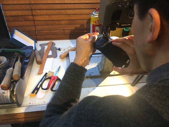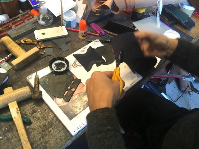 所狭しと道具と材料で埋まる空間はレザーの良い香り。