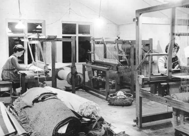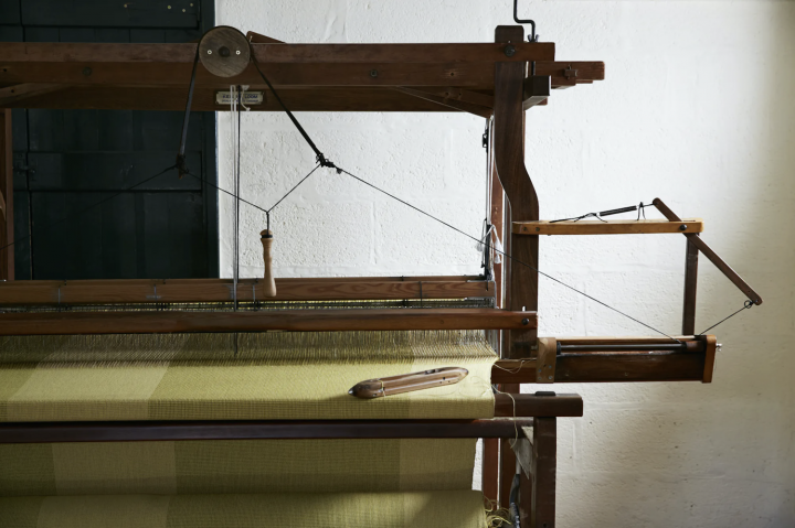 昔ながらの足踏み式シャトル織り機から