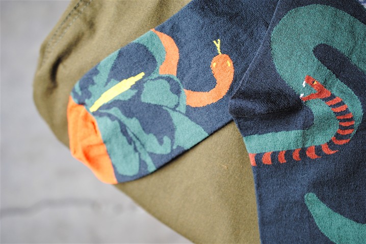 大胆な柄ながら、肌に乗せると馴染みやすい淡いマスタードカラー、