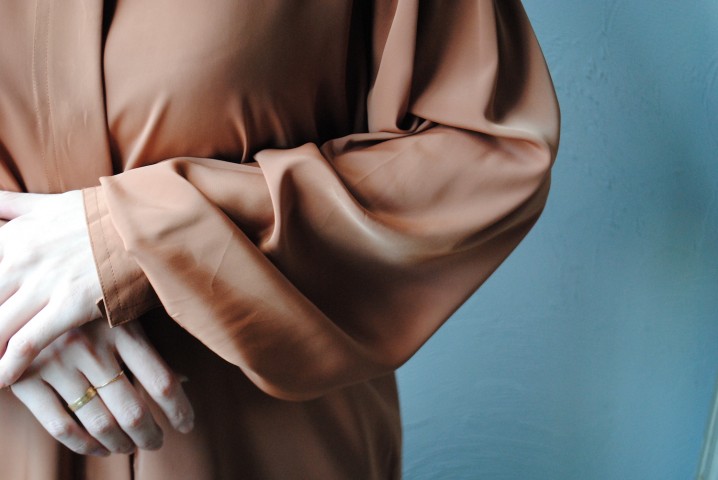 ポリエステル材のしなやかな動き、素材独特の光沢がエレガントにも魅せてくれる一枚。