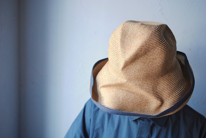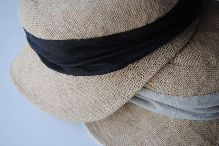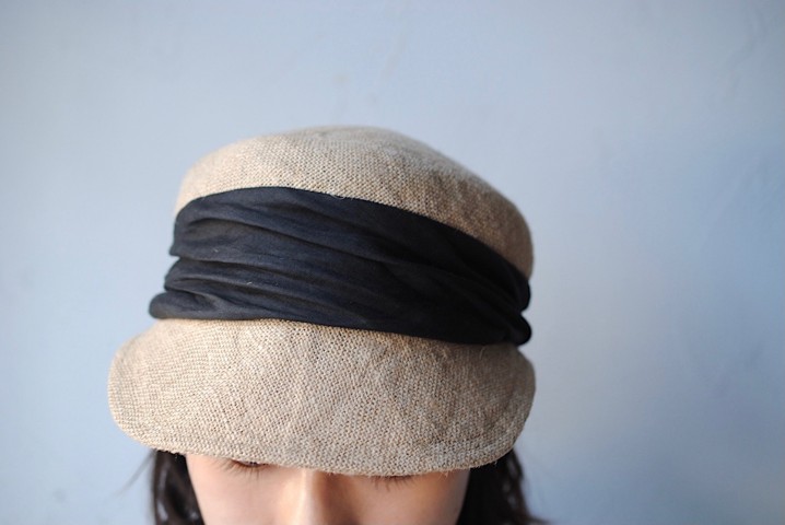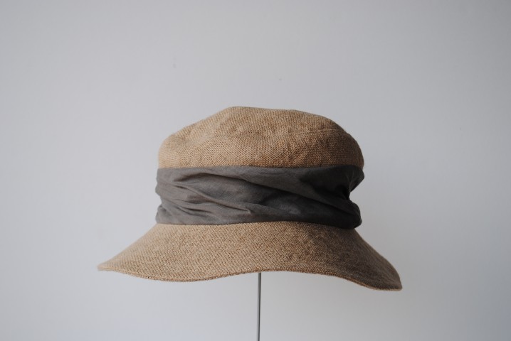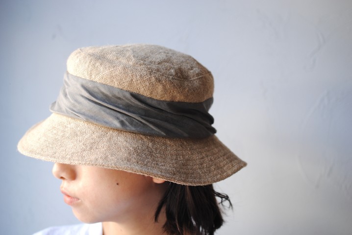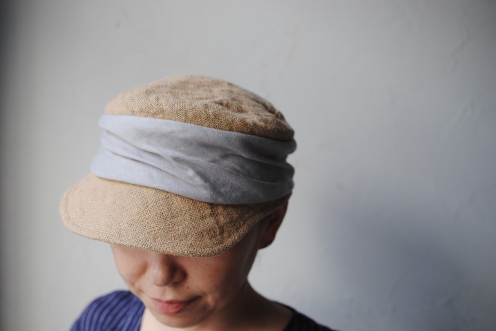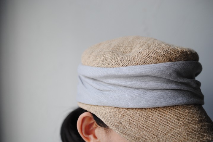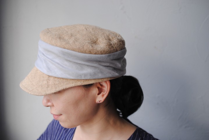 ドレープを寄せたリネンの切り替えが印象的なジュートキャップ。
