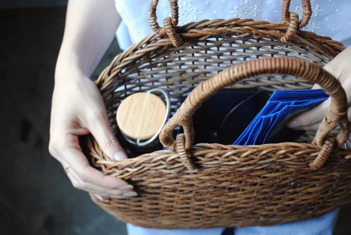 気分を盛り上げてくれるカゴバッグに、好みの飲み物を持参して、