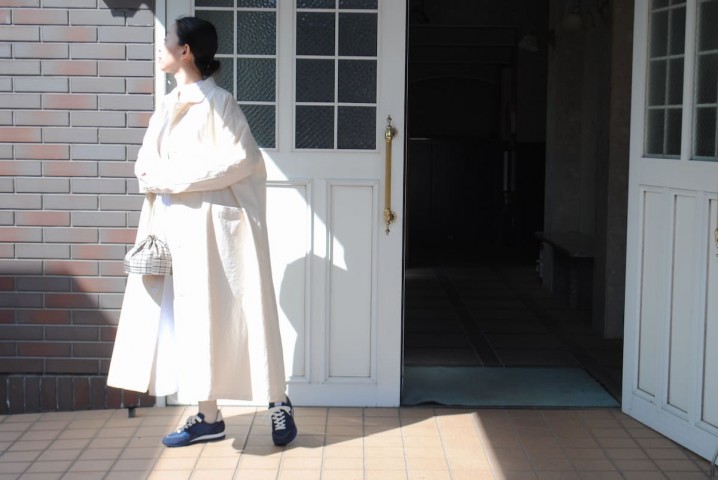 生成りのオーバーコートにノベスタのネイビー。