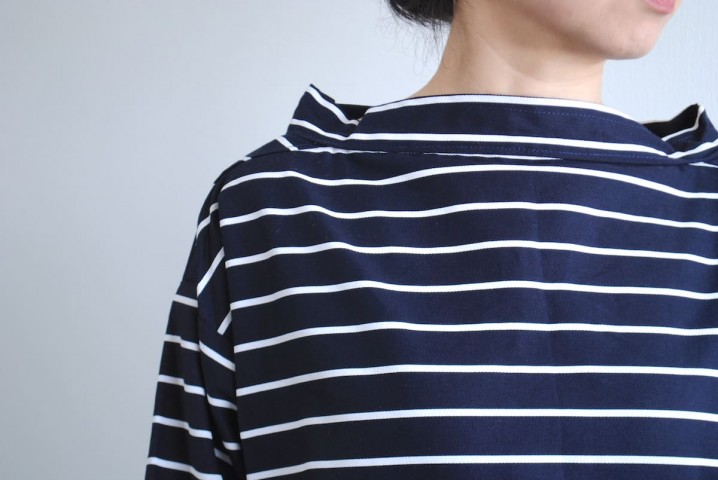 開きすぎないボートネック、立ち襟が女性らしくもあって野暮さはなし。