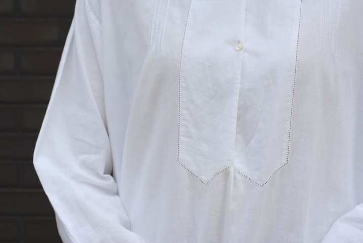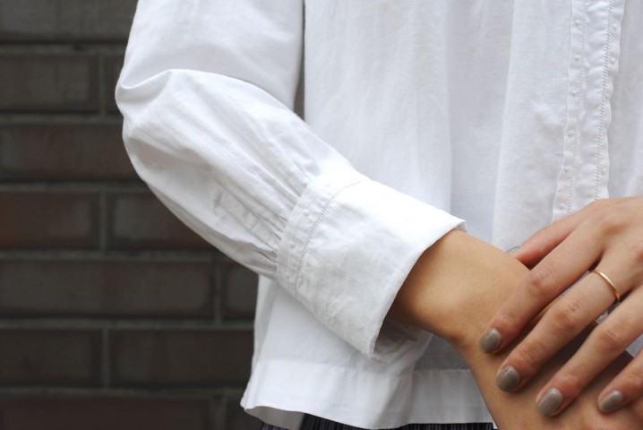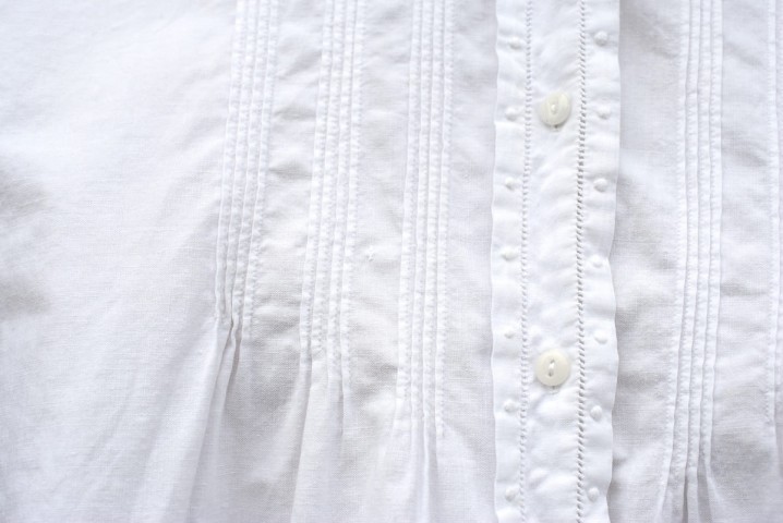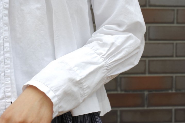 細かなギャザー、繊細なレース、長めの袖リブ。