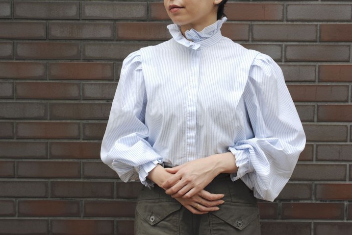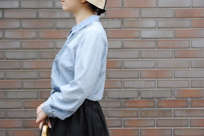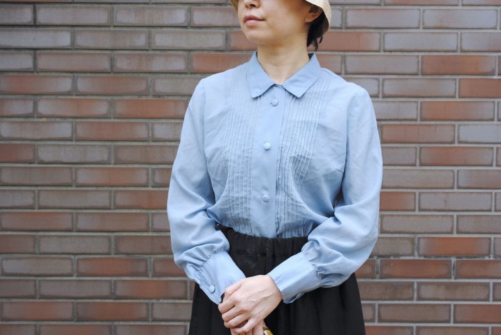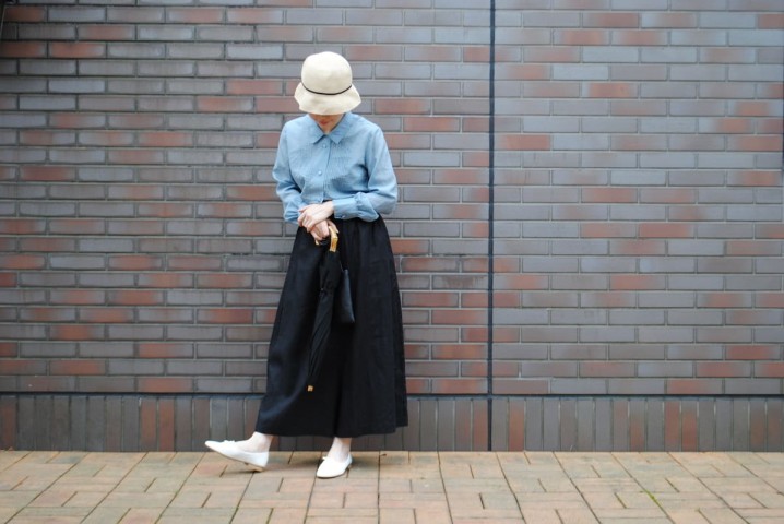 トップスは、顔色を優しく映す淡いブルーのブラウス。