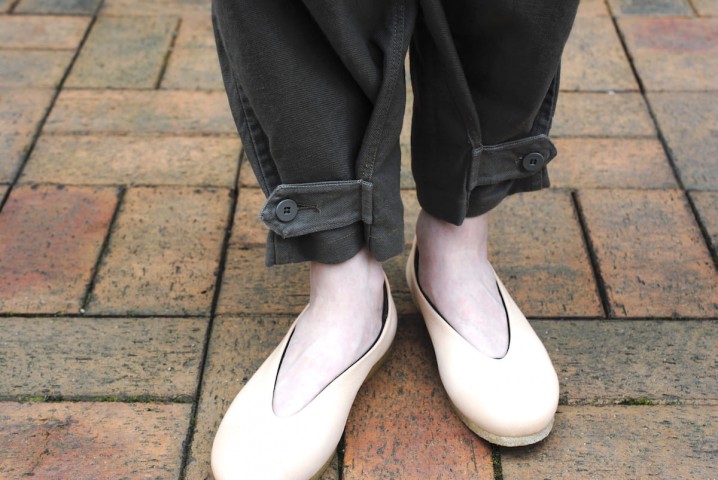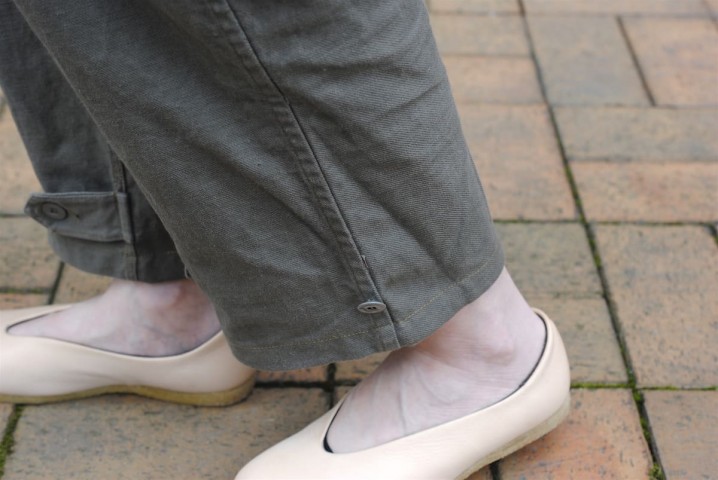 足首にあるベルトを留めると、裾がキュッとすぼまり