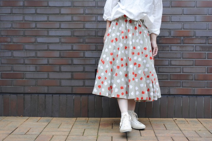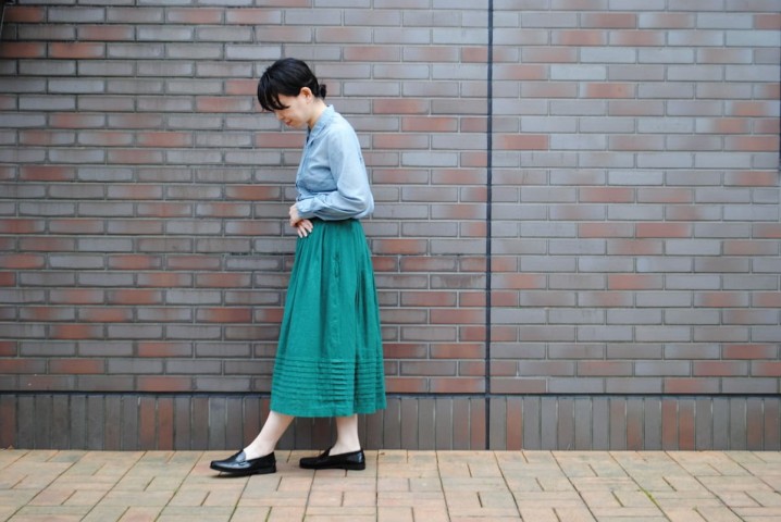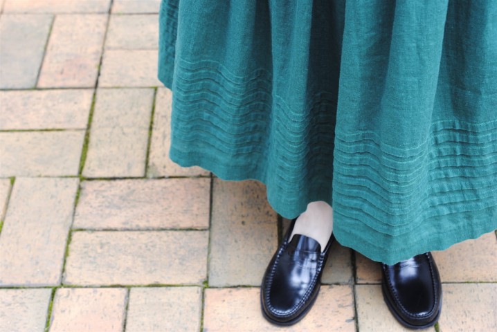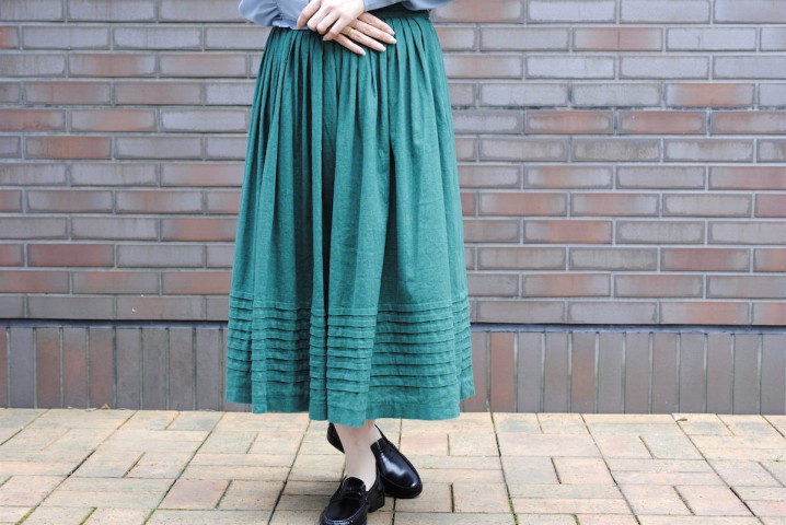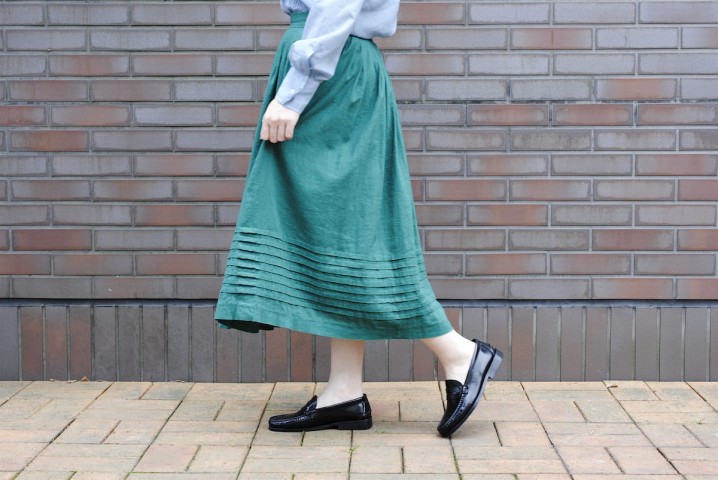 鮮やかなグリーンが目を惹く、リネンスカート。