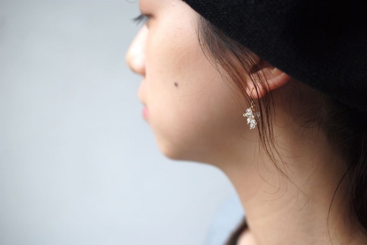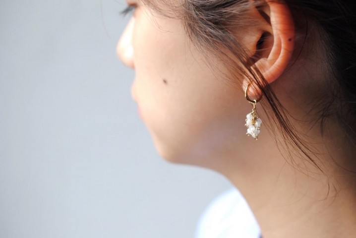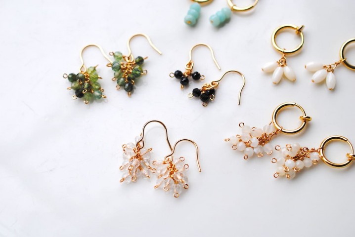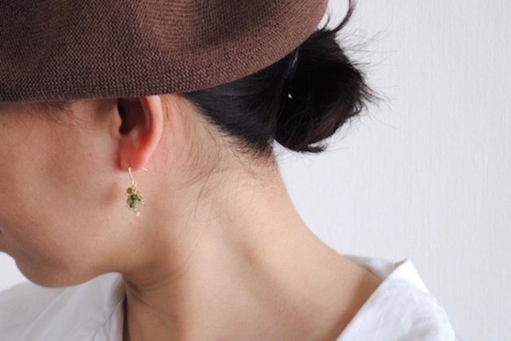 耳元で小刻みに揺れるクォーツのぶどうピアス。