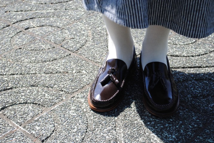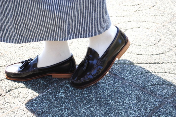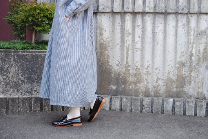 細いストライプのワンピースには、クラシカルなローファースタイル。