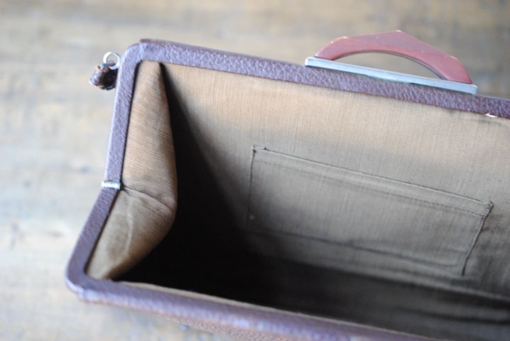 ブラウンのシボ革、ベロのデザイン、ベークライトの留め具。。