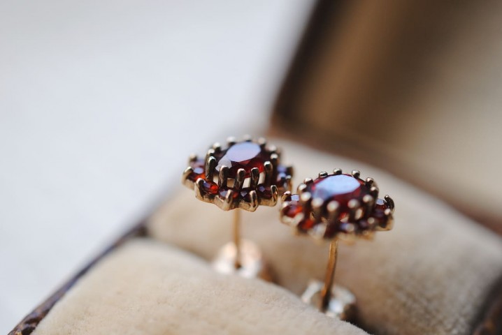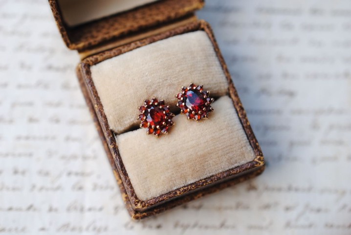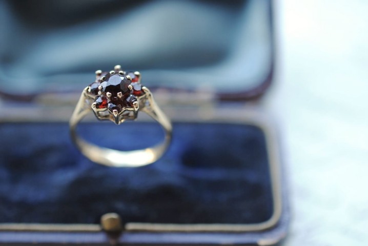 小さなガーネット石で囲むようにデザインされた贅沢な一点。