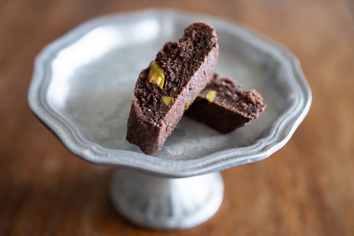 サクッと軽い食感のピスタチオ入ビスコッティ。濃厚なチョコレートに、ふわっとオレンジが香ります。