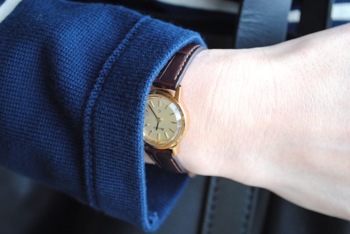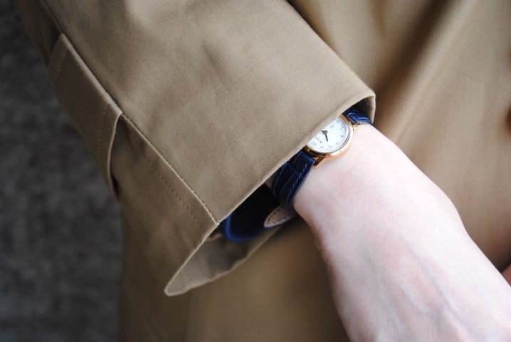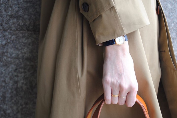ゴールドに馴染むブラウンのベルトが柔らかな雰囲気を作ります。