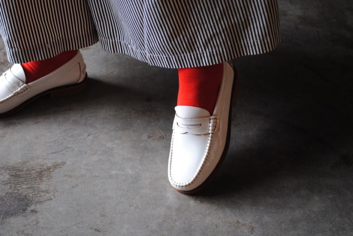 少しトーンの落ちた赤ソックスに、白ローファー。