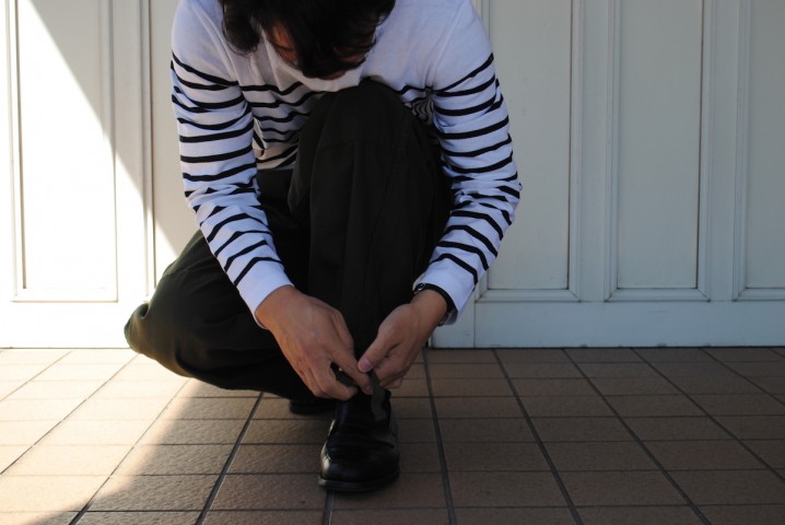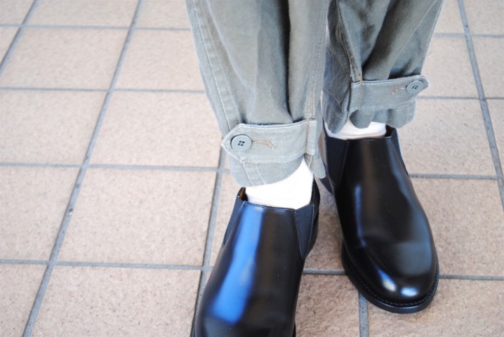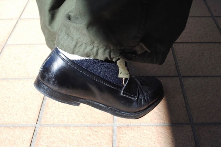 九分丈のラフな印象なのでスニーカーよりもレザーシューズ、