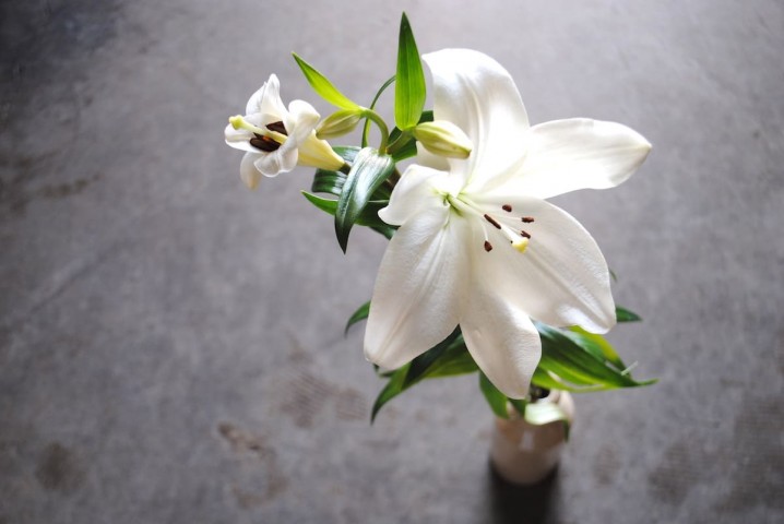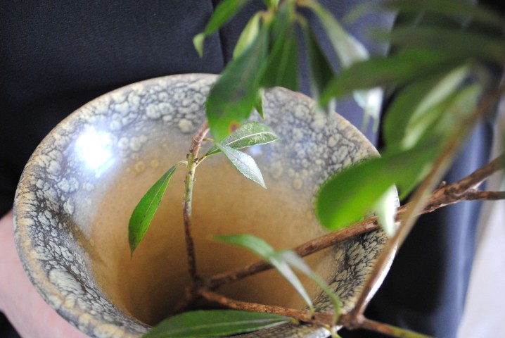 注ぎ口のくぼみに茎を立てかけてるとお花が上手くまとまってくれるので、