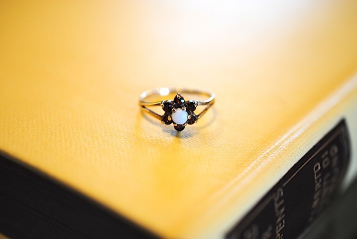 ガーネットの花びらに中央にオパールと贅沢なリングは