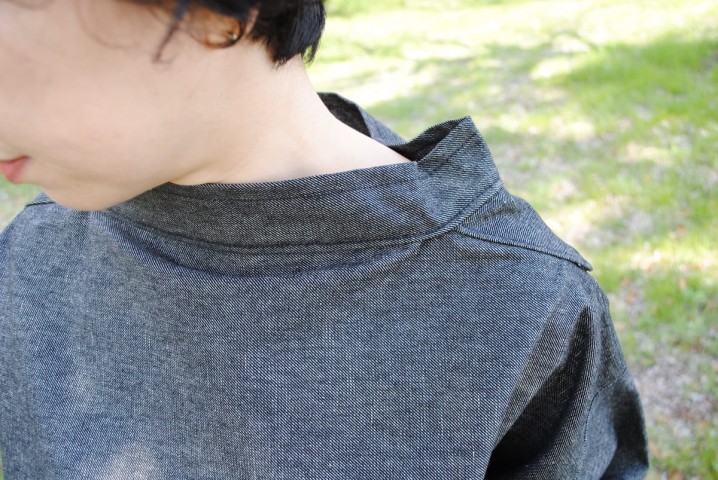 ハイネックとボートネックが合わさった様な立ち上がりのあるシルエットです。