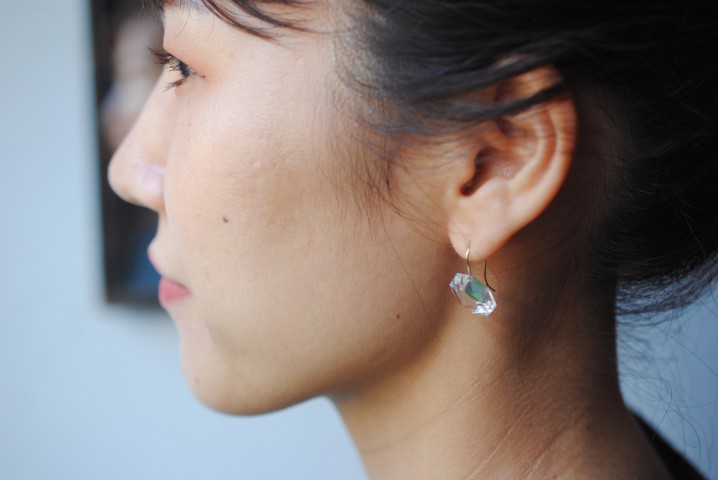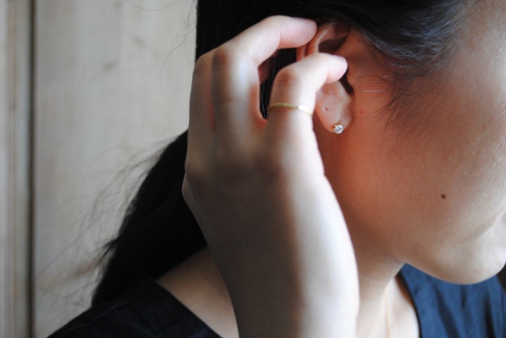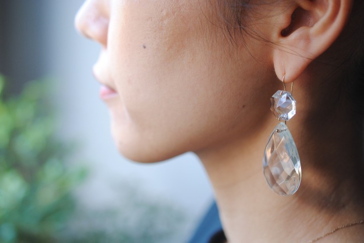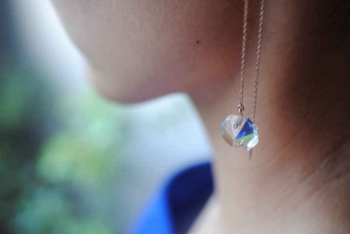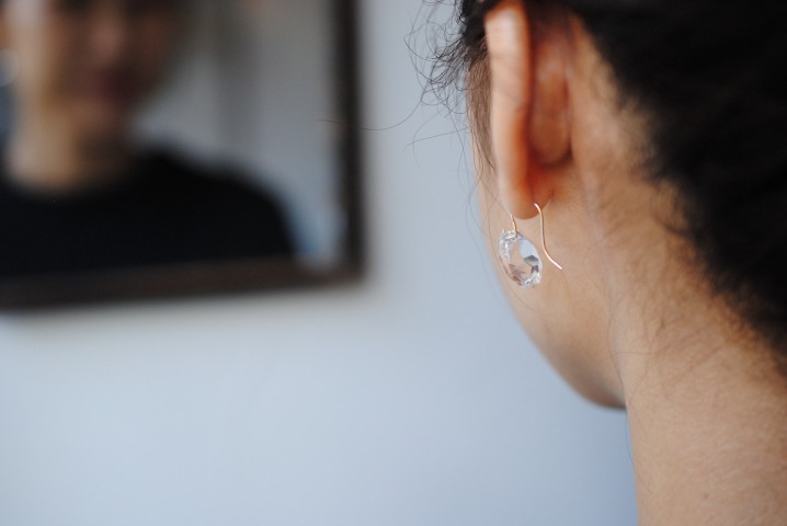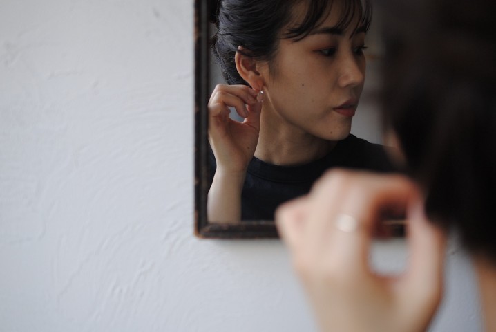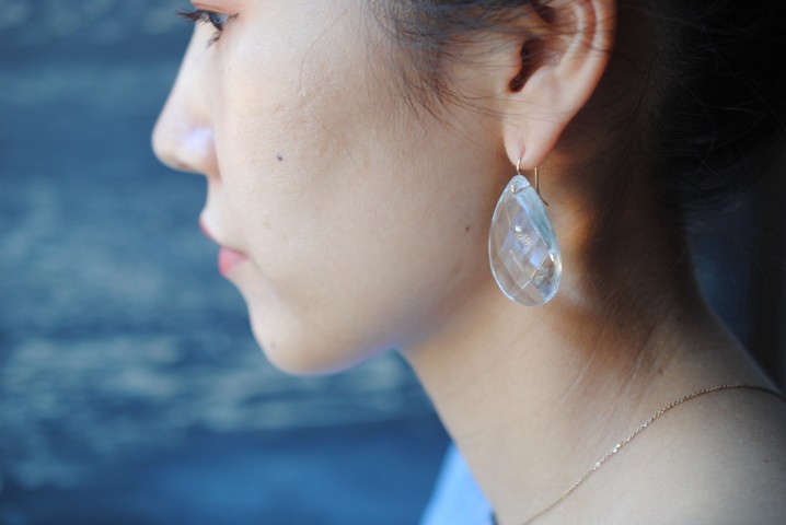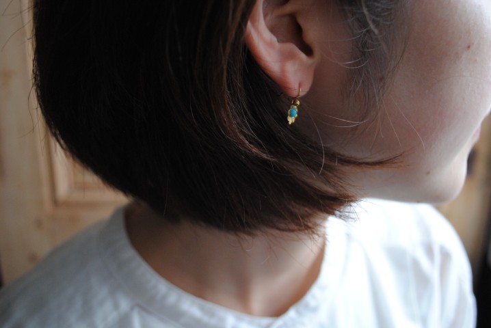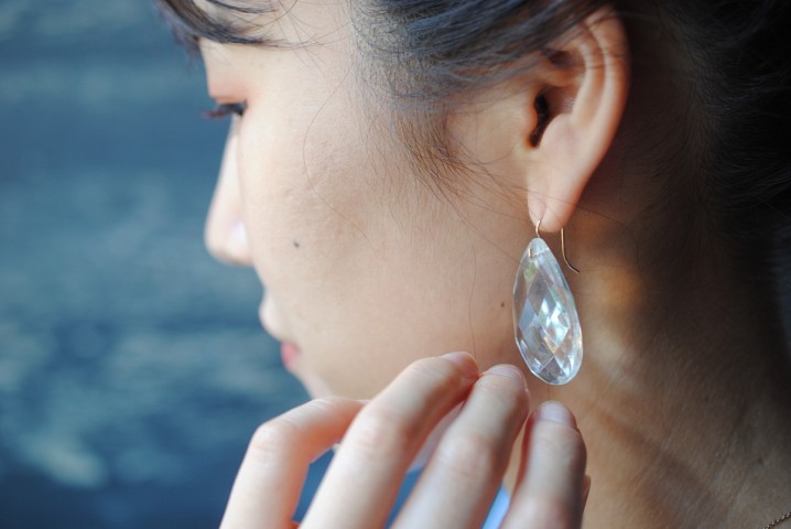 存在感のあるドロップピアスは、正面に雫型がくる作りにしています。