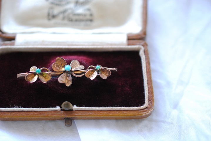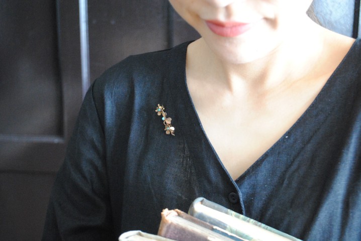 自然界のものをモチーフにすることの多かった時代に作られた、躍動感のあるクローバーデザインが上品な大人のブローチ。