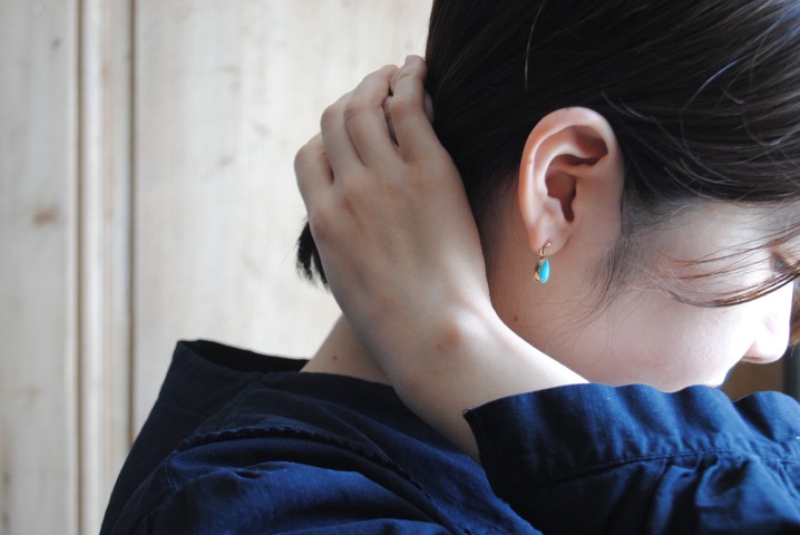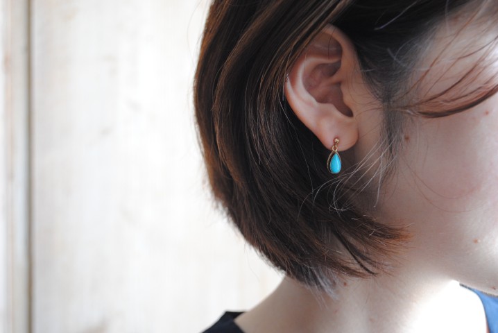 覆輪留めされたすっきりとした台座に、ぷっくりとしたターコイズがセットされた、雫型のドロップピアス。