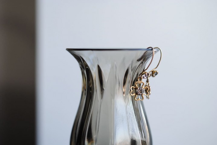 クリスタルガラスがフック先端と、クローバー中央にあしらわれたクラシックな雰囲気のピアス。